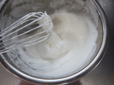 1.卵白のボウルに塩ひとつまみ(分量外)入れ、泡だて器(又はハンドミキサー)で泡立てる。七割程度まで泡立ったら、グラニュー糖を半量加え、角が立つまで泡立てる。