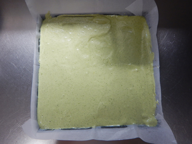 天板に入れたらスケッパーで切るように端まで均一になるように広げます。