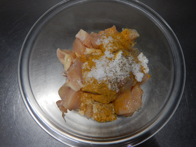 鶏むね肉にスパイスで味付け。薄力粉でコーティング。