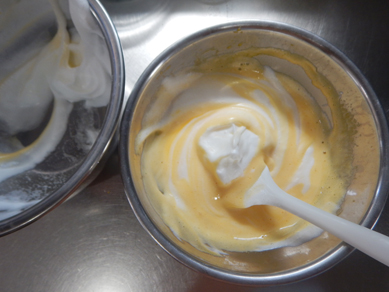 2.卵黄のボウルに泡立てた卵白を1/3ずつ入れ、都度底から掬い上げるように混ぜる。