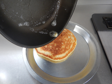 7.焼き上がったらパンケーキの表面をバター(5gで三枚ぬるイメージ)をぬる。