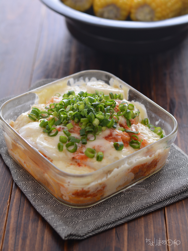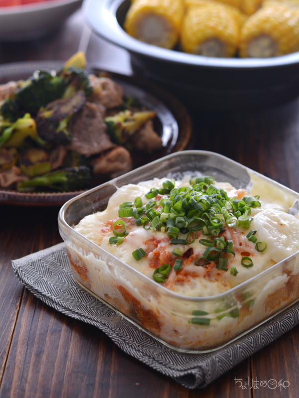 耐熱皿に長いも、キムチ、チーズ、長いも、チーズの順に入れてレンジで加熱。