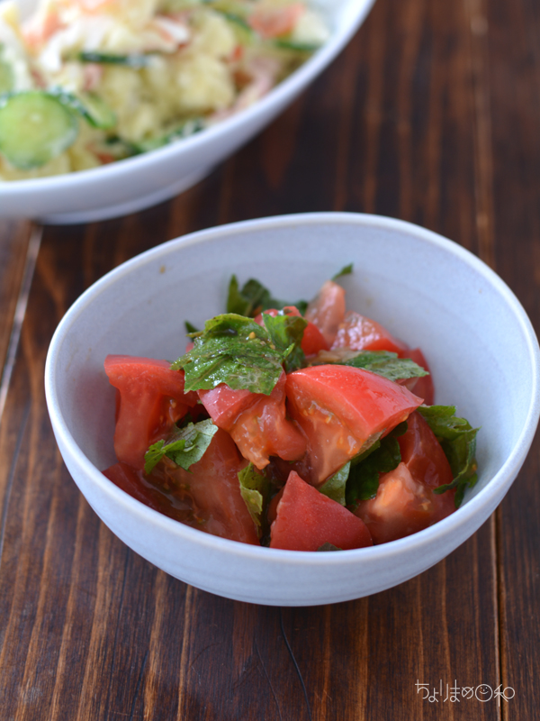 トマトと大葉、梅肉とにんにく醤油で、さっと簡単和えもの。