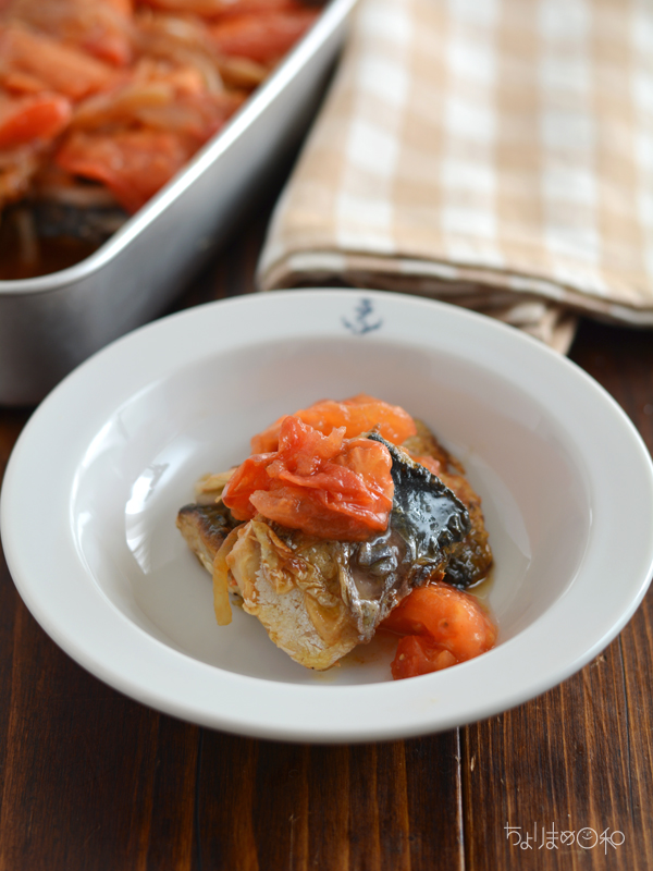 焼きあがったら保存容器に並べて、同じフライパンで玉ねぎを炒め、トマトを加えてトマトの角が取れるまで炒める。