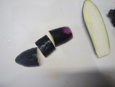 ・なすは縦半分に切り、皮を格子状に切り込みを入れる。食べやすい大きさに切る。
