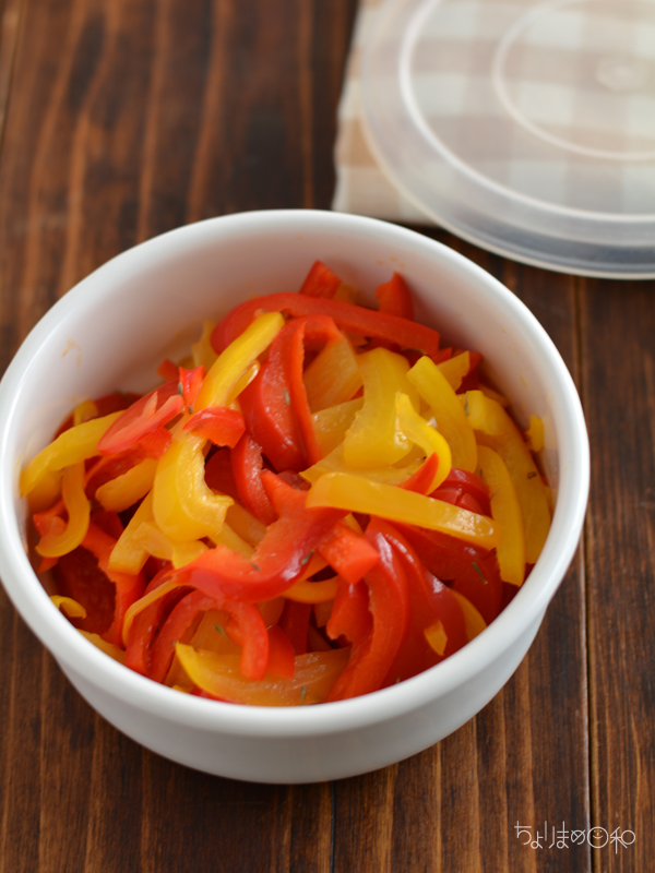 パプリカにオリーブ油とドライタイムを和えてから、レンジで加熱。