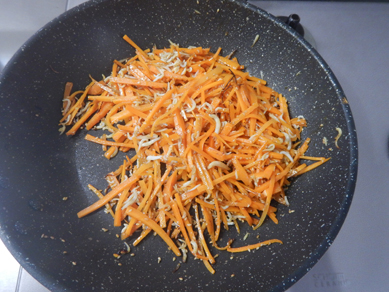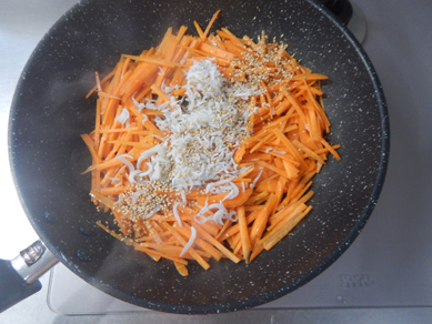 2.にんじんに油が回ったら、しらす、いりごまを入れて炒める。