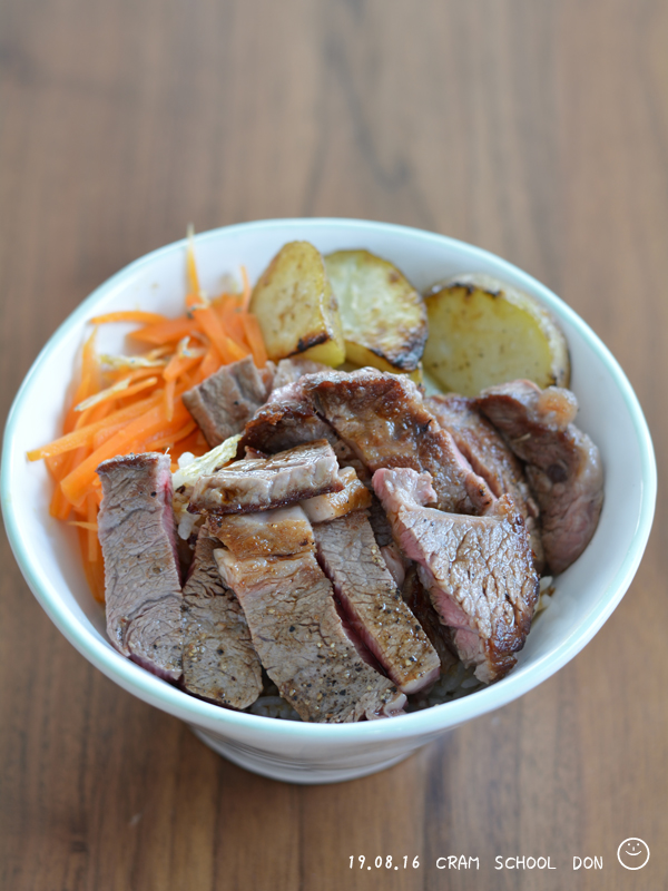 この日の塾前丼は、まったく映えてないステーキ丼。