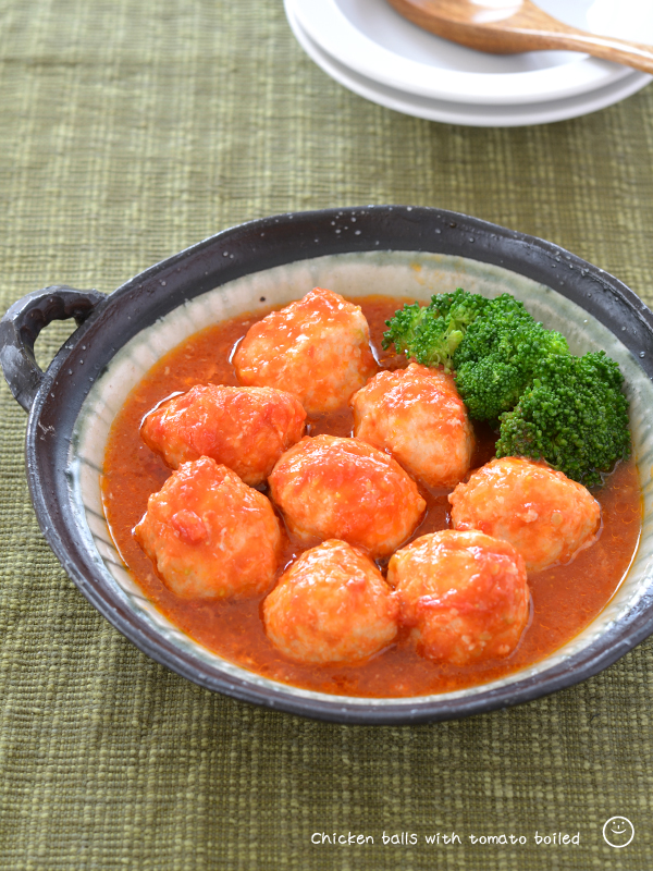 チキンボールのたねをまるめて、トマトソースの材料の中にドボンと埋めて、