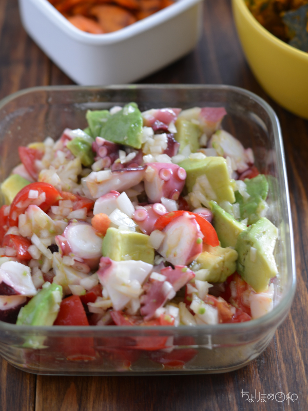 タコ、アボカド、ミニトマト、玉ねぎをオリーブ油、酢、塩、こしょうで調味。