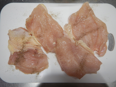 1.鶏肉の両面に塩、黒こしょうをなじませる。