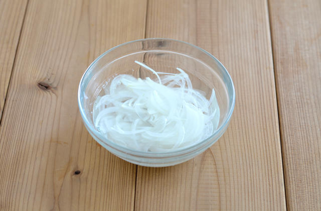 加熱中に、玉ねぎは薄切りにして水にさらしておきます。