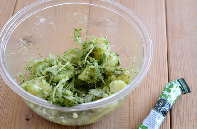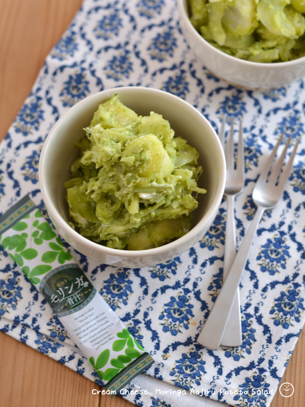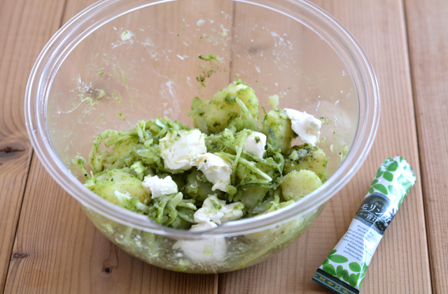 モリンガ青汁1袋を入れ、酢、塩こしょうを加えて和えます。