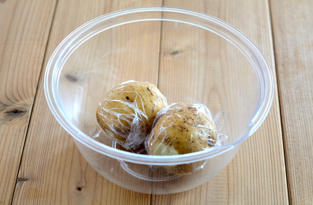 1.じゃがいもは皮に切り込みを入れ、水にくぐらせてラップで1つずつ包む。電子レンジ(600W)で5分加熱し、上下返して2分加熱する。そのまま1分ほど蒸らす。