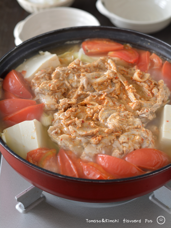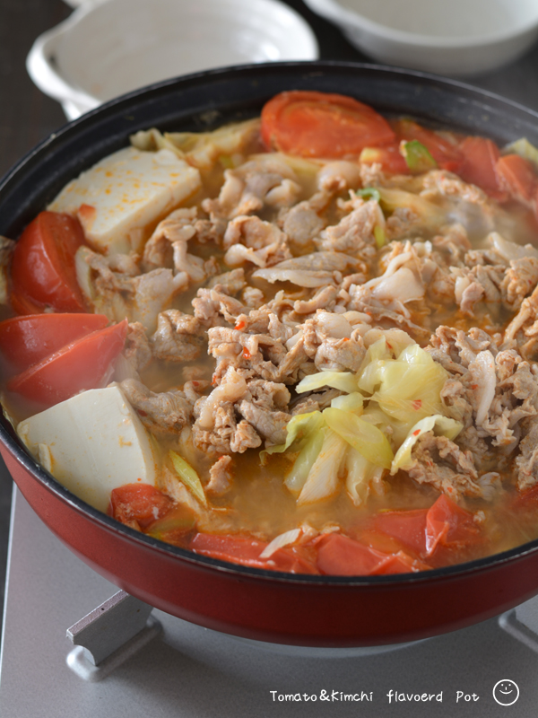 2.土鍋に水、鶏がらの素を入れ、キャベツ、長ねぎを入れる。中央に【1】をのせ、トマトと豆腐は周りに入れる。