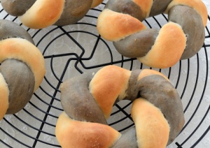 バター不使用の1つの生地を2つに分け、ねりごま黒白で生地をそれぞれ作り、二つの生地をねじって成形したら焼成!