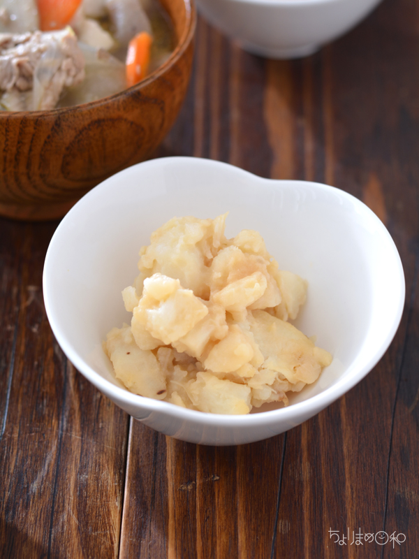 長芋をバターを共にレンジで加熱して、しょうゆを加えて崩しあえて出来上がり。