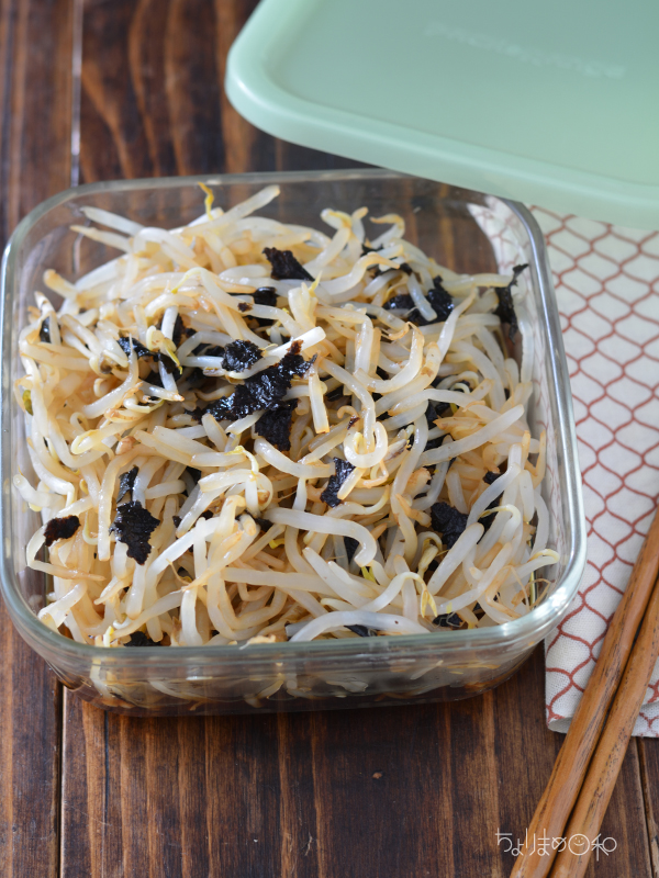 1.耐熱ボウルにもやしを入れ、ラップをして電子レンジ(600W)で4分加熱する。ざるにあげて冷まし、水気をしぼる。
