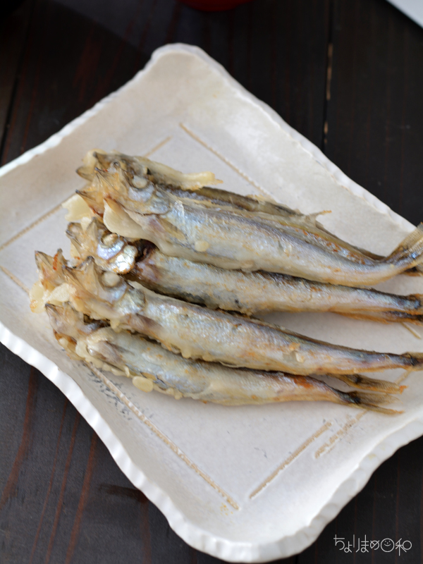 米粉を水で溶いた衣にシシャモをつけて揚げ焼き。