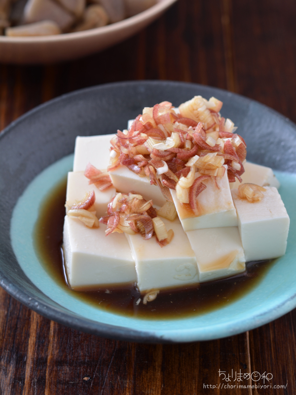 刻んだみょうがをポン酢に漬けておいて豆腐にかけるだけ。