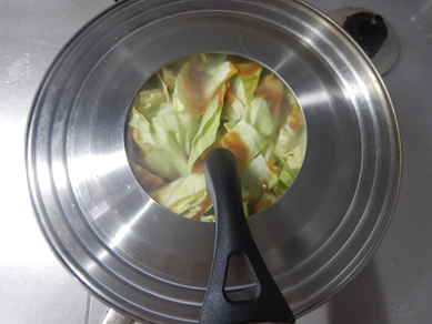 3.鶏肉が白っぽくなってきたら、キャベツを覆うように広げて入れる。Aを回しかけ、蓋をして2分蒸し焼きする。