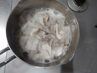1.鍋に水を入れて豚肉を入れる。中火にかけてゆで、沸騰したら水気をきる。