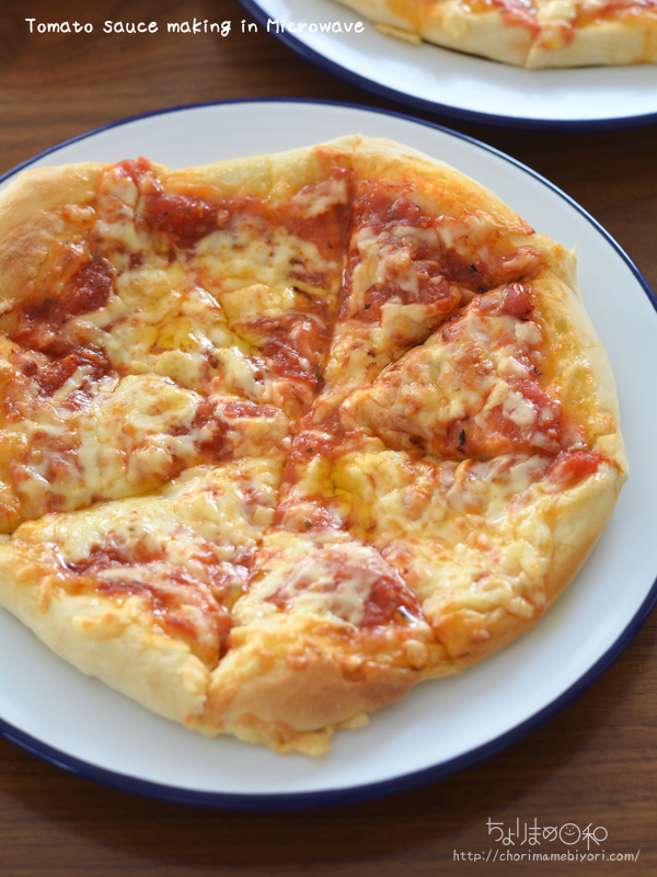 宿題の作成ついでにピザ生地を作って、なんならレンジでトマトソースも作っちゃって、それを昼ごはんにしようって。