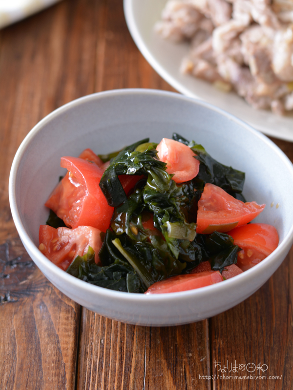 トマトとわかめ、酢、にんにく醤油、ごま油であえて出来上がり。
