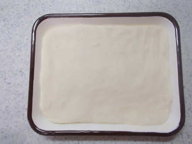 5.打ち粉(強力粉)をふった台に生地をのせ、めん棒でバットの大きさに伸ばす。オリーブ油(分量外)を塗ったバットに生地をおく。