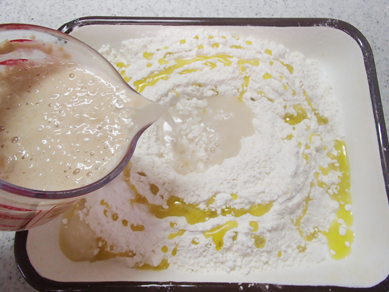 ・粉を計量し、砂糖、塩、オリーブ油をバットに入れ、中央にくぼみを作る。