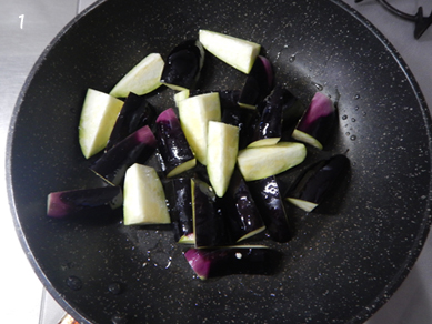 1.フライパンになす、油、塩を入れて和え、蓋をして中火にかける。途中何度か全体を混ぜて蒸し焼きする。