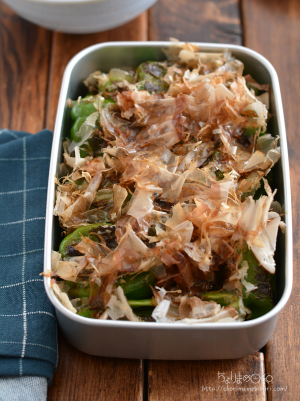 我が家定番のピーマンを油で炒めて、しょうゆと花かつおをかけるピーマンおかか。