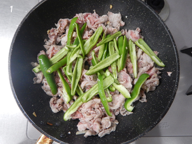 1.フライパンに油、にんにくを入れて中火で熱し、豚肉、塩を入れて炒める。豚肉に火が通ってきたらピーマンを入れて炒める。