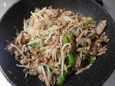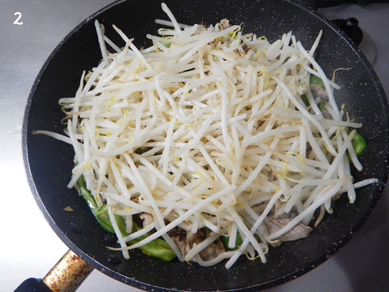 2.Aを加えて炒め、もやしを広げて1分ほど蒸し焼きにする。