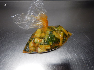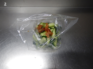 2.ポリ袋にきゅうり、たたいた梅干し、ごま油、しょうゆ、豆板醤を入れてなじませる。