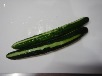 1.きゅうりはピーラーでまだらに向く。食べやすい長さ(2~3cm)に切る。