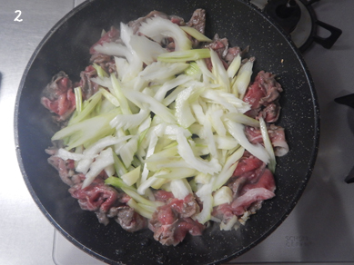 2.牛肉の色が変わり始めたら、中央をあけてセロリを入れて炒める。