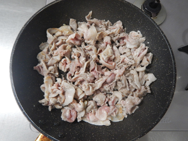 1.フライパンに油、にんにくを入れて中火で熱し、下準備した豚肉を入れて炒める。