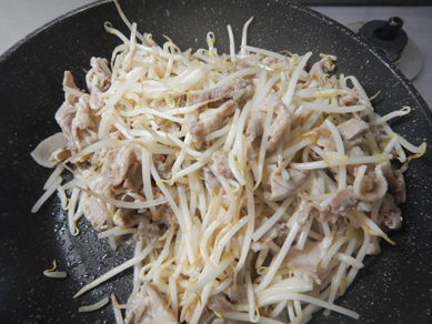 2.豚肉の色が変わってきたらもやしを広げて入れ、蓋をして中火のまま2分ほど蒸し焼きにする。