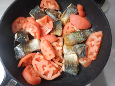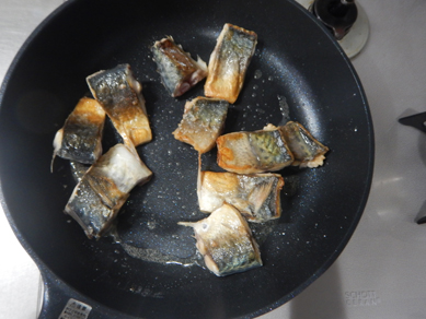 1.サバに薄力粉をふる。フライパンに油を入れて中火で熱し、サバを皮目から入れて全体を焼く。