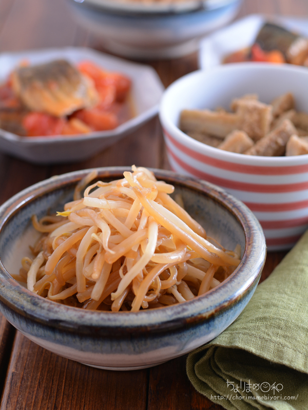 もやしの中華サラダと、作り置きのごぼうのおかず。