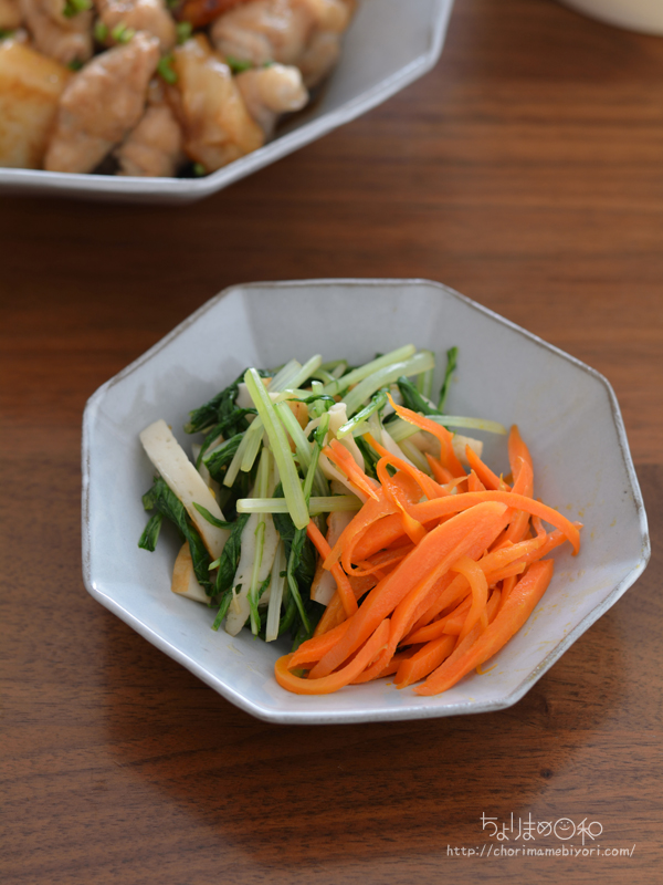 にんじんは油で炒めて塩とみりんで調味。作り置きのも良し。