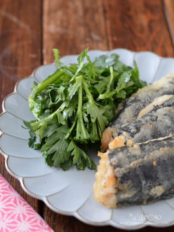 付け合わせは主とちょりの大好物の春菊のサラダ。
