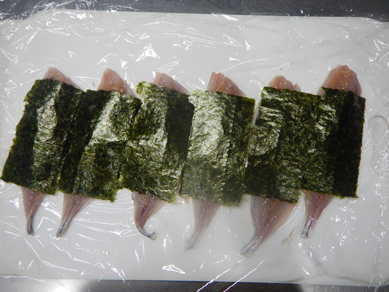 1.サバの身にねり梅をぬる。のりをのせてしばらくおいてなじませる。