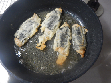 アジの海苔がはがれないようにボチャンしてちょんちょんして余分な衣を落とします。