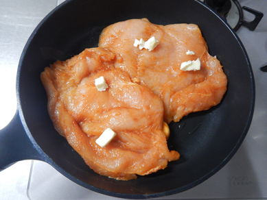 オリーブ油をしいて鶏肉をのせたら鶏肉の上にバターを散らす。
