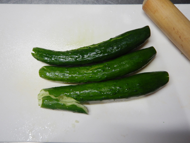 1.きゅうりはまな板の上におき、めん棒でたたく。手で割く。