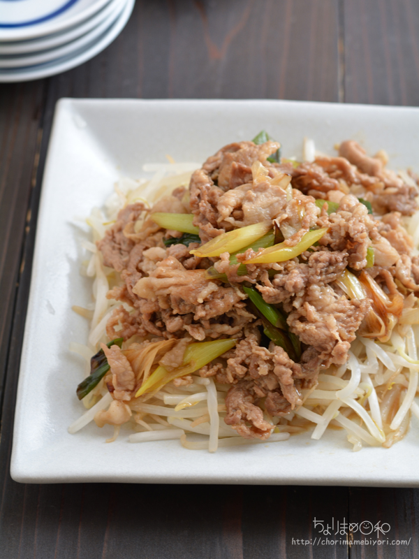 豚肉とねぎを炒めものをもやしにのせました。という料理です。