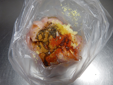 ポリ袋に鶏肉と香味野菜、調味料を入れます。