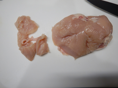 鶏むね肉をV字にそぎ切りにします。観音開きは不要。(σ´∀`)σ